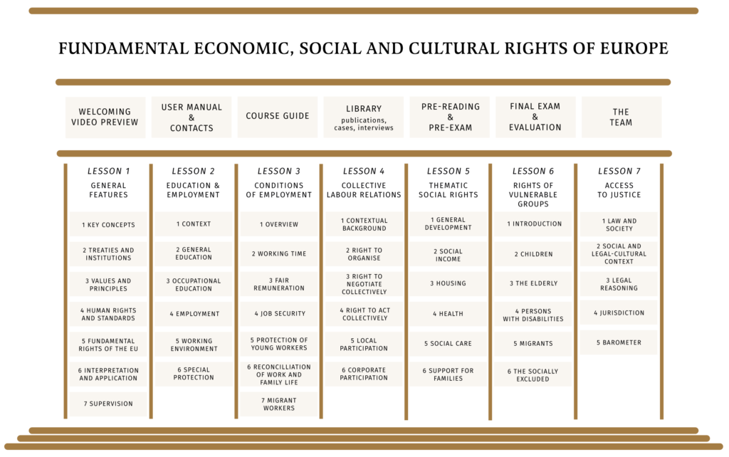 Fundamental Economic, Social and Cultural Rights of Europe is a uniquely intuitive and flexible online course on European ESC rights. The course be used to teach students ESC rights either at the bachelor or master level. Licences to complete the course can be acquired either fully (5 ECTS) or in part for only labour or social law (3 ECTS).
